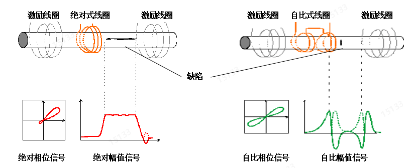 如图所示,涡流检测仪产生交变电流供给激励线圈,激励线圈产生交变的磁场,交变磁场在连续油管表面感生出涡流,涡流受到缺陷的影响反过来影响绝对式线圈或自比式线圈使其发生变化,通过信号的放大和处理得到绝对相位信号、绝对幅值信号和自比相位信号、自比幅值信号。