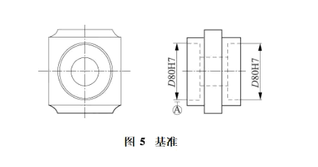 如图5所示,两D80的孔左侧为基准A,要求右侧孔相对基准同轴度D0102,此时只能分别测头A90B9,A90B180两方向测量,建立公共轴线,求右侧孔对基准的同轴度,直接评价即得结果。