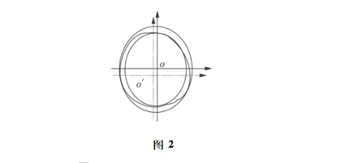 b)另外一个方面,当基准元素的形状误差,即柱度误差较大时,将产生很大的影响。一方面由于采集的点数有限,如果圆柱度误差大,则意味着每增加一个点,计算机计算生成的圆柱轴线方向矢量将与前者产生大的偏离,由此,再来测量被测元素的同轴度,也将产生很大的偏差。如图2,为一个截面的采点情况,假设原来均匀采四个点,沿坐标方向,形成如图2所示的圆心O,当增加左下方45°方向的两个点时,圆点将可能向左下方移动到O′,从而轴线产生偏离。